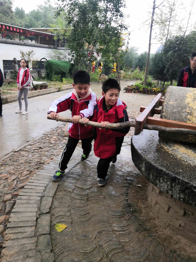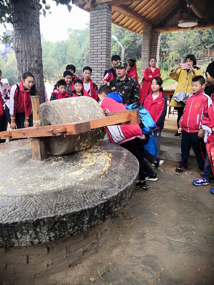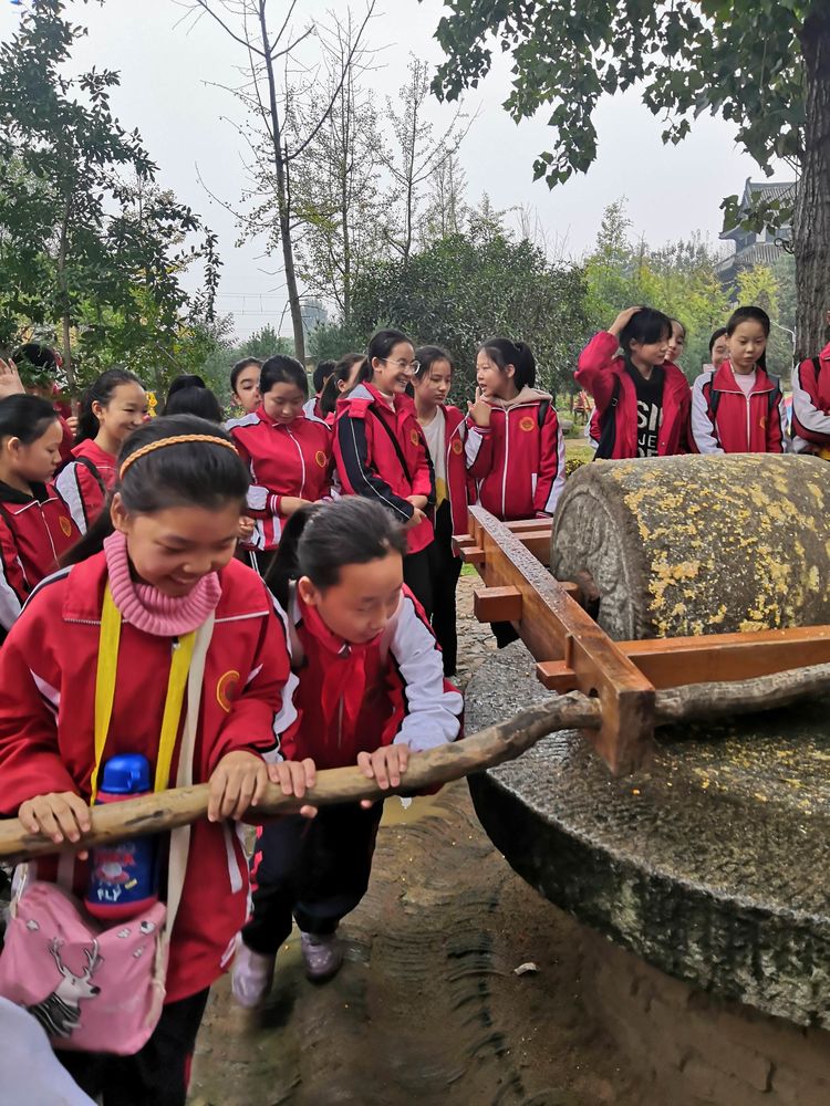 大碾盘前,老师和我们一起体验推碾磨面,体会粮食种植,加工和制做成食物的艰辛过程。同学们此时才深深体会到“一粥一餐,当思来之不易”的真谛。站在老式织布机前,我们方懂“半丝半缕,恒念物力维艰"的内涵。