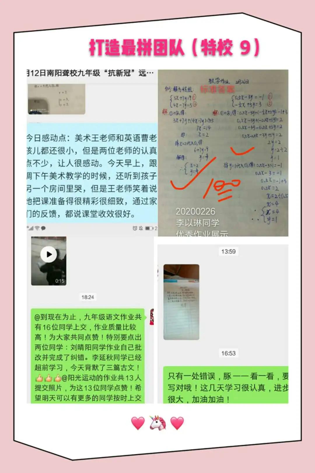 身为班主任的田新老师,从每个学生的个性和特点出发,与班级全体教师一起制定目标、拓展思路,避虚击实,化难为易,让班级的网上教学呈现出了生动和高效的局面。在途径上,将视频授课、群内指导和任务推送相结合;在环节上,立主“难点习题化、讲解多渠道、家长来参与、评比树榜样”;在形式上,集体大课堂与小窗口辅导相结合,老师检查与小组评比相结合;每日点评、每周评优,对于多次不完成作业的钉子户,各位老师更是发挥了一追到底的钉子精神,常常为了等一份作业熬到深夜。