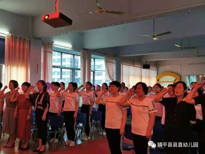 全体教职工重温教师誓言:忠诚人民教育事业,贯彻党的教育方针,履行教师神圣职责。立德树人、为人师表。平等对待每一位孩子,为幼儿的健康快乐成长而努力奋斗!为学前教育事业奉献自己的一切!