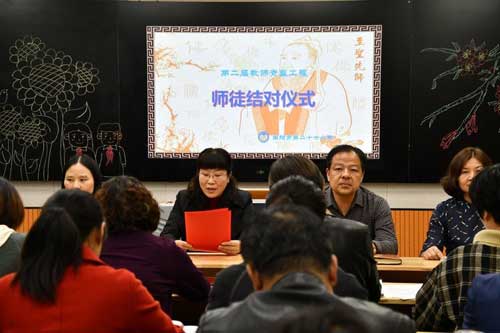为了打造更优良的师资队伍,促进青年教师更快更好地成长,11月4日,南阳市第二十七小学举行第二届“青蓝工程”拜师结对仪式,王舒、翟华宇等二十位教师喜结帮扶对子。宛城区教体局老干股股长田红霞出席仪式,仪式由副校长赵红彩主持。