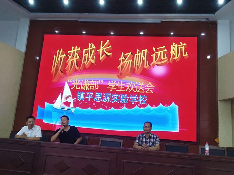 “绿树阴浓夏日长,楼台倒影入池塘。”时间过得飞快,转眼间我们已走过春的烂漫,迎来夏的蓬勃。我校九年级学生经过三年的学习,增长了知识,收获了成功。在2019年5月份的二模选拔考试中,我校有12名同学进入全县前300名。其中宋丽闪、邹奕婧、彭蕊、王云祥等4名同学跻身全县前100名。2019年7月5日上午8点我校在多功能报告厅举行了“收获成长,扬帆远航”“光谦部”学生欢送会。