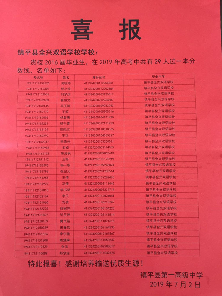 镇平全兴双语实验学校怎么样?镇平一高中亲自到校送喜报 镇平县 镇平一高 镇平全兴双语实验学校 未知/阳光 2019-07-04 次浏览 喜讯连报,佳音频传!2019年7月2日,镇平一高中李校长、王校长亲自到镇平全兴双语实验学校报喜。我校2016届升入一高的毕业生,在2019年全国高考中共有29人过一本线。升入六高和其他学校今年高考一本上线人数正在统计中!特此报喜! 感谢全体师生的付出,感谢所有家长朋友的支持,感谢社会各界的关爱;镇平全兴双语实验学校将一如既往拼搏进取,努力使各项工作层楼更上!