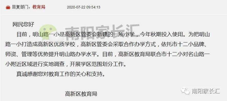 对此,相关部门予以回复,而且还透露了该校的师资优势:将与南阳市十二小进行合作办学,这无疑对明山路小学来说,拥有了一个高起点发展的机遇,附近的居民们多年的期盼迎来了一个好消息!