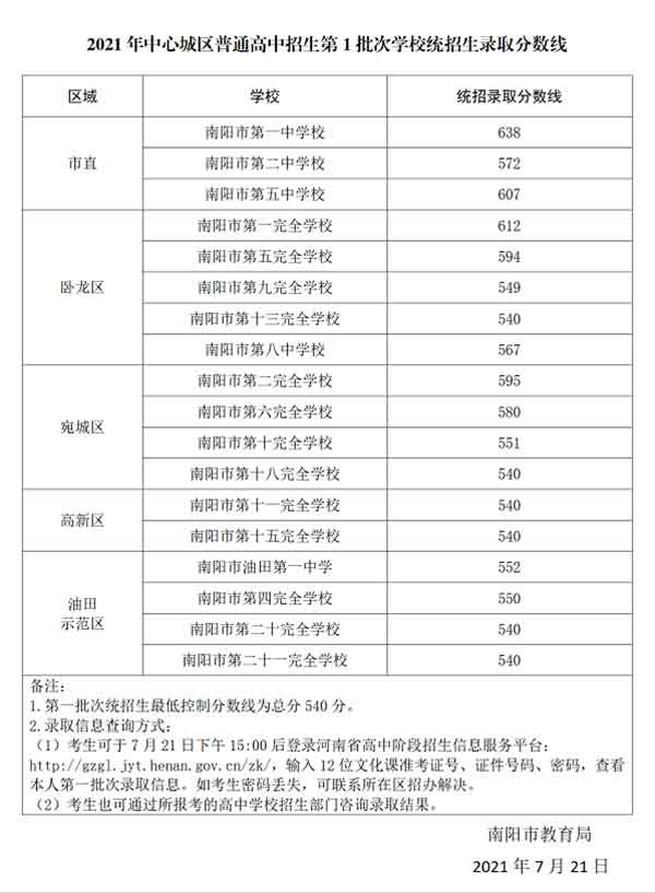 2021年南阳市中心城区中招一批次高中录取数线发布